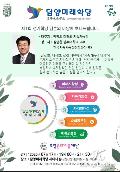 추성문화예술재단(이사장 나항도)은 오는 7월 17일(수) 저녁 7시, 전남 담양군 금성면 금성산성대숲마을도·농교류센터(담양미래학당 세미나실)에서 ‘담양의 미래와 지속가능성’을 주제로 제1회 담양미래학당 정기학당을 개최한다.