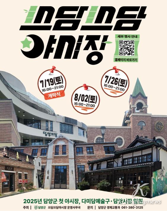 담양군이 오는 7월 19일부터 3주간 매주 토요일마다 다미담예술구와 담양시장 일원에서 ‘2025 쓰담쓰담 야시장’을 연다.