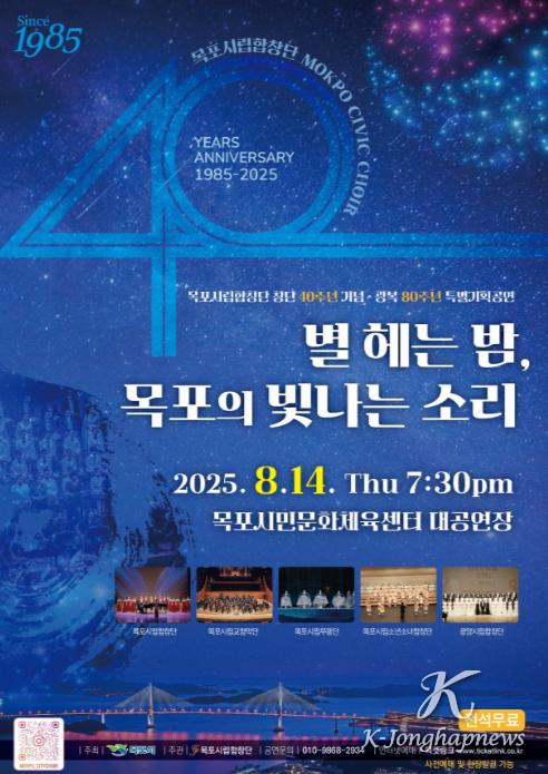 목포시립합창단이 오는 8월 14일 오후 7시 30분, 목포시민문화체육센터에서 창단 40주년 및 광복 80주년을 기념하는 특별공연 ‘별 헤는 밤, 목포의 빛나는 소리’를 선보인다.