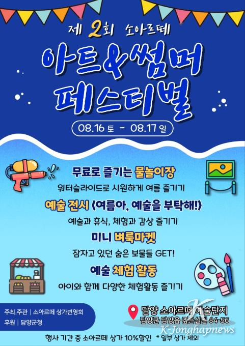‘소아르떼’ 상가번영회가 주최·주관하고 담양군이 후원하는 이번 행사는 방학을 맞은 가족 관광객과 지역민이 함께 즐길 수 있도록 무료 물놀이장, ‘여름아, 예술을 부탁해!’ 전시, 벼룩시장, 다양한 예술 체험으로 구성됐다.