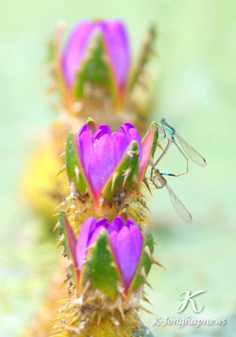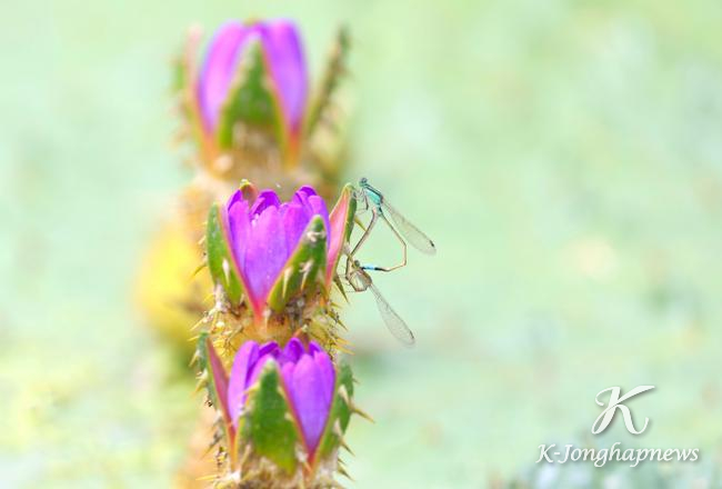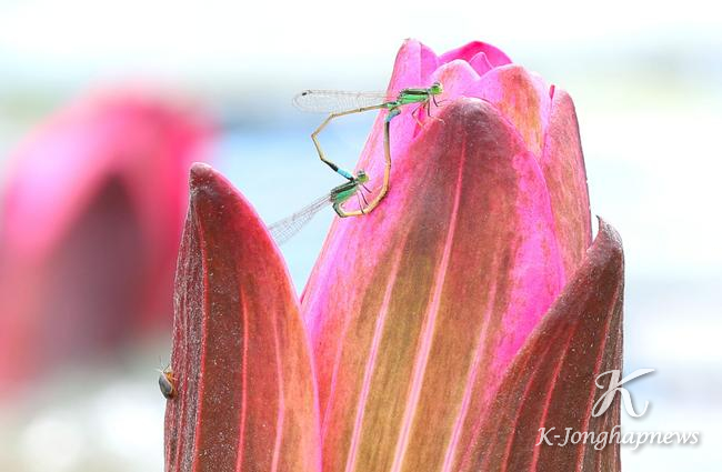 2일 경남 함양군 상림공원 연꽃단지에서 실잠자리 한쌍이 활짝 핀 수련꽃에 앉아 짝짓기를 하고 있다.
