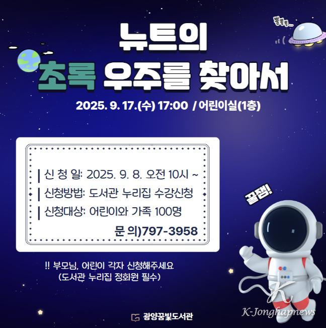 광양시 광양꿈빛도서관은 독서의 달을 맞아 오는 9월 17일 오후 5시, 도서관 어린이실에서 어린이와 가족 100명을 대상으로 특별공연 ‘뉴트의 초록 우주를 찾아서’를 운영한다고 밝혔다.