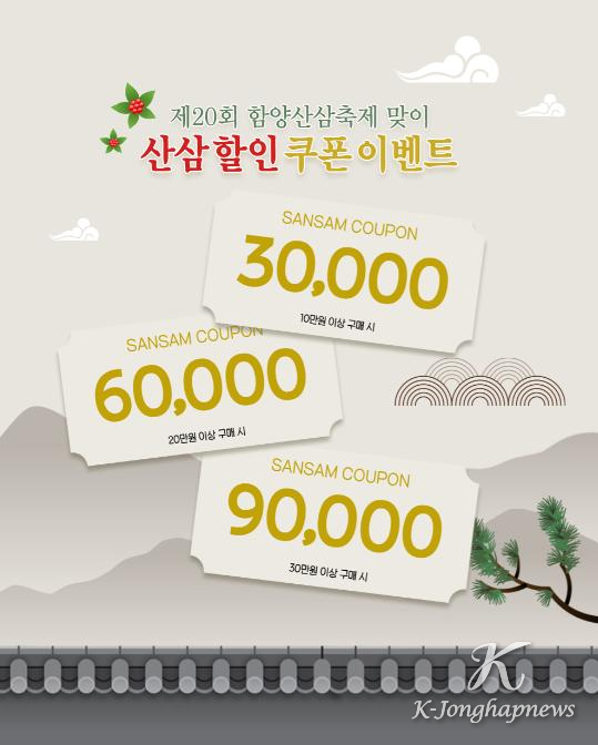 이번 할인 행사는 오는 9월 18일부터 22일까지 열리는 ‘제20회 함양산삼축제’와 연계한 행사로, 산삼 제품에 관심 있는 소비자들에게 산삼 제품에 한해, 10만 원 이상 구매 시 3만 원 할인, 20만 원 이상 구매 시 6만 원 할인, 30만 원 이상 구매 시 9만 원 할인 쿠폰을 제공할 예정이다.