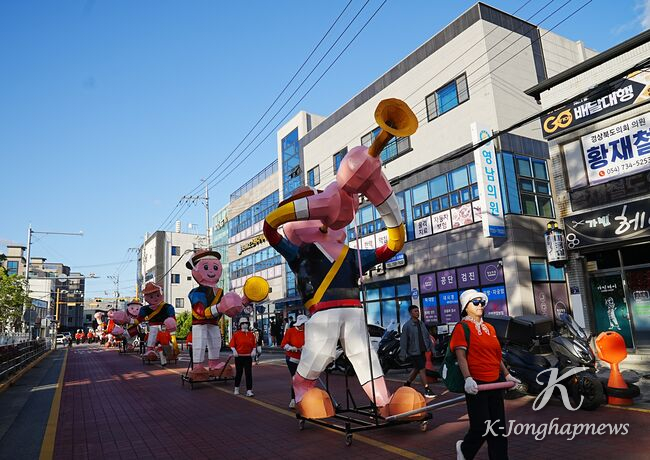 풍물 7남매 대형조형물이 야시홀 선셋퍼레이드에 참여했다.