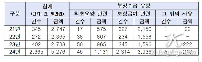 특히, 산재 승인 이후 보험급여 수령 과정에서 발생하는 부정수급이 급격히 늘어 2023년 대비 건수 6.7배, 금액은 2.4배 증가해 전체 유형 중 가장 높은 증가폭을 보였다.