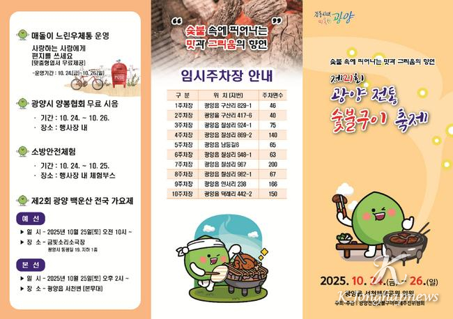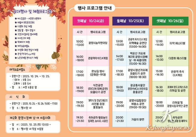 부대행사로는 서천무지개분수를 배경으로 한 에어바운스 ‘매돌이 포토존’, 수변무대 버스킹, 한우 시식회, 광양불고기 마그넷 만들기, 숯불구이 테마관 운영, ‘구경구미’ 컬러링 엽서 체험 등 광양의 문화를 보고, 먹고, 즐길 수 있는 다양한 프로그램이 준비됐다.