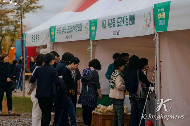 농특산물 판매부스에 사람들이 농산물을 구경하고 있다