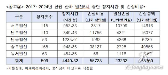 ▲ 불시정지 사례는 총 509 건에 달했으며 누적 정지시간은 4,440 시간 32 분으로 185 일에 이르는 것으로 집계됐다 .