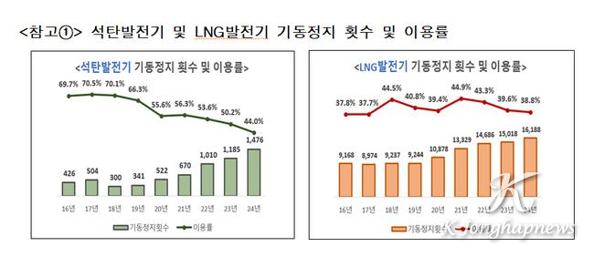 2016 년 석탄발전기의 기동정지 횟수는 426, LNG 발전기는 9,168 회에 불과했으나 매년 꾸준히 늘어나 2024 년에는 각각 1,476 회와 16,188 회로 증가했다 석탄은 3.4, LNG1.7 배 늘어난 수치다 .