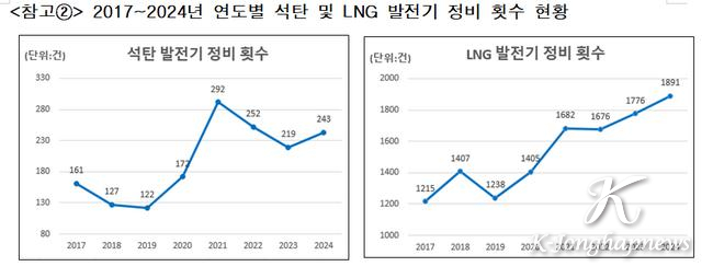실제 발전기의 정비 횟수도 꾸준히 증가하고 있다 . 2017 년 석탄발전기의 정비는 161, LNG 발전기는 1,215 회였으나 , 2024 년에는 각각 243 회와 1,891 회로 약 1.5 배 늘었다 .